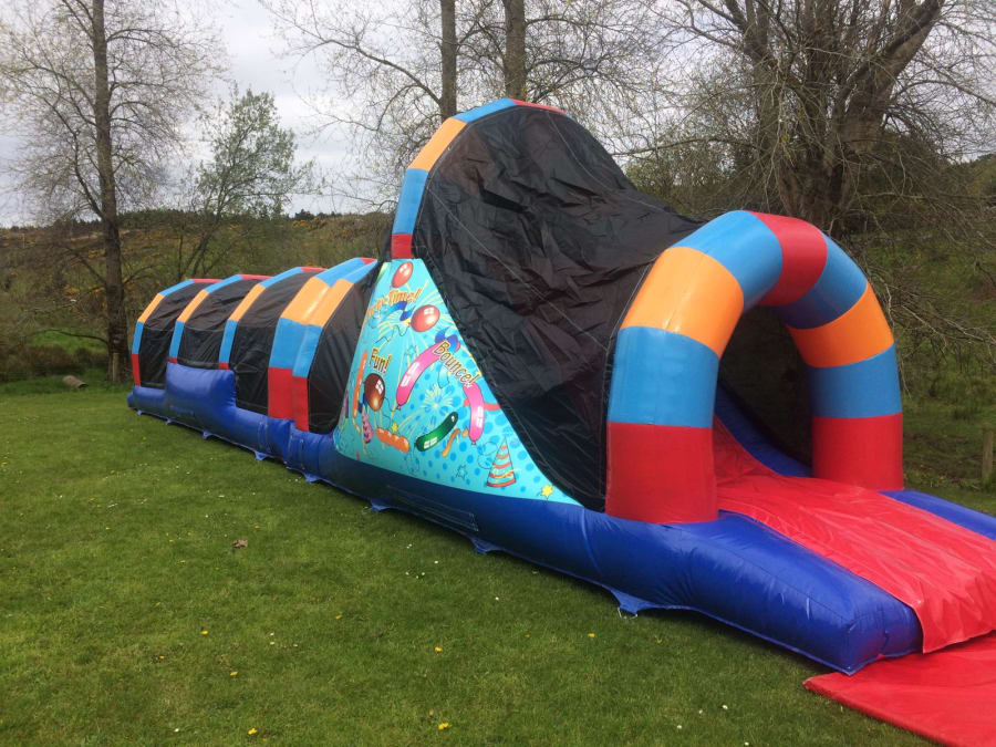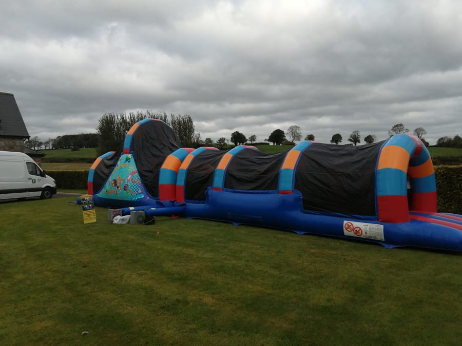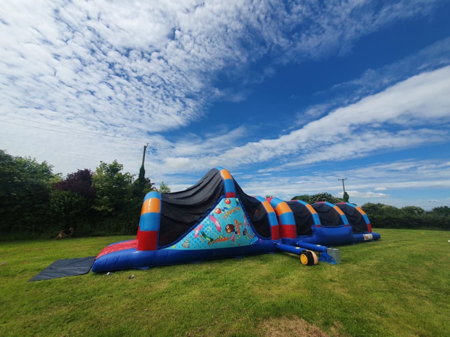 This 50ft Rainbow Party obstacle course is very popular. It has a 10ft high slide, tunnels, bish bash and bouncy areas. It is ideal for kids of all ages, both boys and girls.